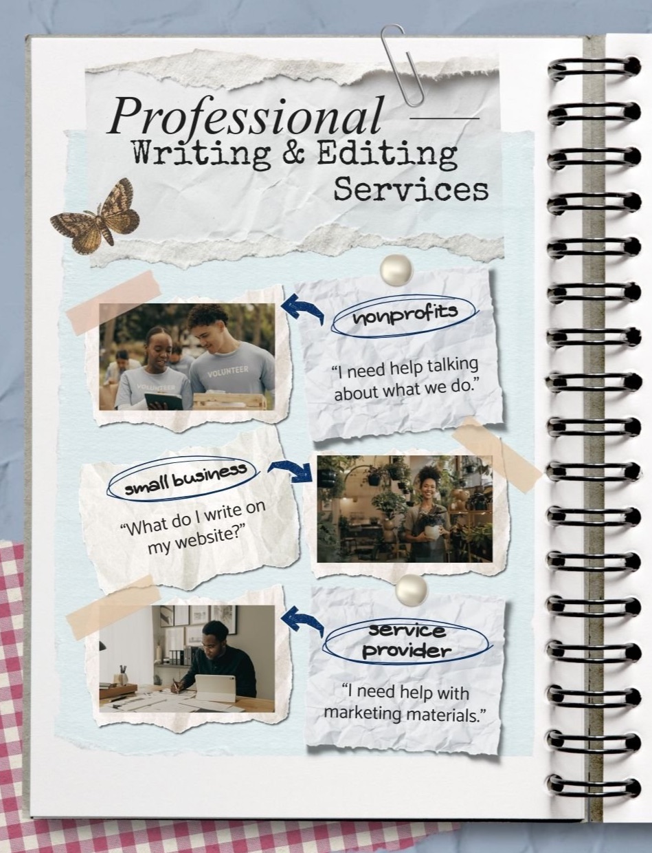 Leverage my background in business and marketing when you need help with the words for your nonprofit marketing, building a website for your small business, or working out how to talk about your services to potential clients.